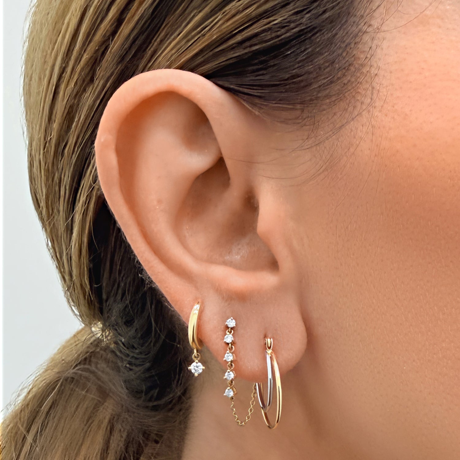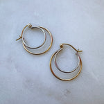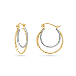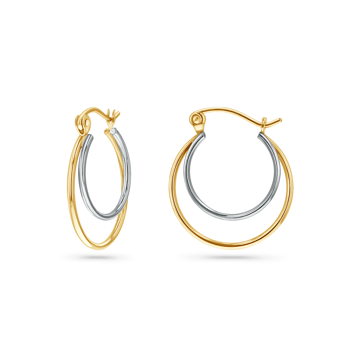 Meet your new everyday essentials. Our Two Tone Layered Hoop Earrings bring the perfect mix of white and yellow Gold in one effortless pair. Lightweight, polished, and made to stack, each hoop gives the look of two earrings with just one piercing. Wear them solo or layered, either way, they shine from every angle and make your stack effortless to pair with different metals!