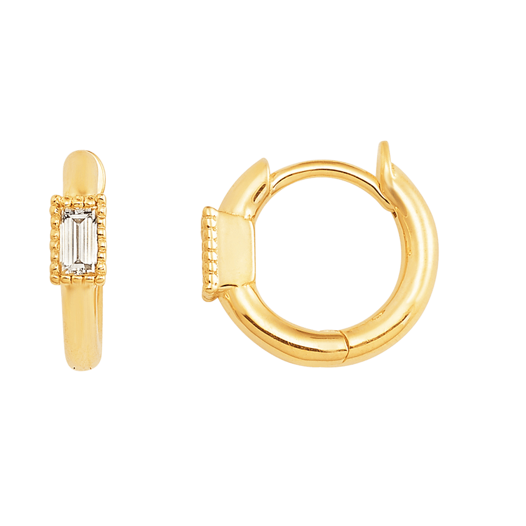 The handcrafted Baby Gold Shapes Collection Baguette Diamond Huggie Earrings are hand set with baguette cut diamonds. These stunning gold hoops are transformed with single uniquely cut .15ct diamonds. You won't ever want to take these off.