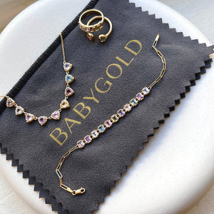 Let your 14K Gold sparkle and shine with this chic polishing cloth designed for seamless care of all your cherished Baby Gold pieces. Diamonds and gemstones easily polished back to their natural luster with simple strokes from this perfectly sized cloth. Reusable and travel friendly, a must have in every jewelry collection.