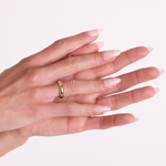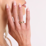 The 14k Crescent Dome Band is approx. 6mm wide and tapers to 3mm. This is a perfect statement piece to add to your stack.