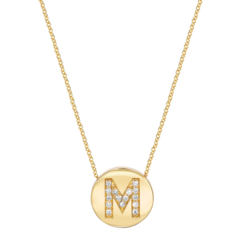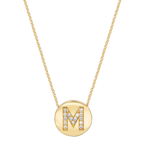 The diamond initial coin necklace is hand set with approximately 0.05-0.12ct of diamonds. It's unique mirror finish shines alongside pave set diamonds. This necklace can be worn every day or on special occasions.
