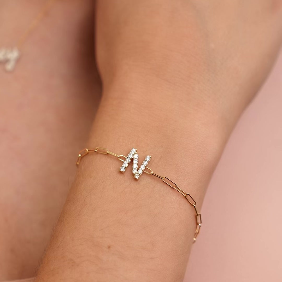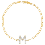 Our 14K solid gold Grand Initial Paper clip bracelet is this years hottest look! Introducing a bolder and bigger diamond initial letter bracelet for the season. This trendy yet classic bracelet is the perfect customizable initial piece. The Paper clip chain links allow for adjustable wear so sizing up or down is no issue. Sturdy, bold and personalized!