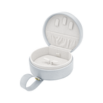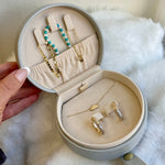 Meet your jewelry's new favorite travel companion. Our Minaudière Jewelry Travel Case combines elegance and practicality in a compact, timeless design. Crafted from smooth vegan leather with luxe hardware, this case is perfect for keeping your treasures safe while on the go. A stretch inner pocket with 5 adjustable hooks all within a structured silhouette and snap closure. This Minaudière is as chic as it is functional—slipping seamlessly into your bag for everyday outings or weekend getaways. The perfect blend of form and function for a life styled in gold.